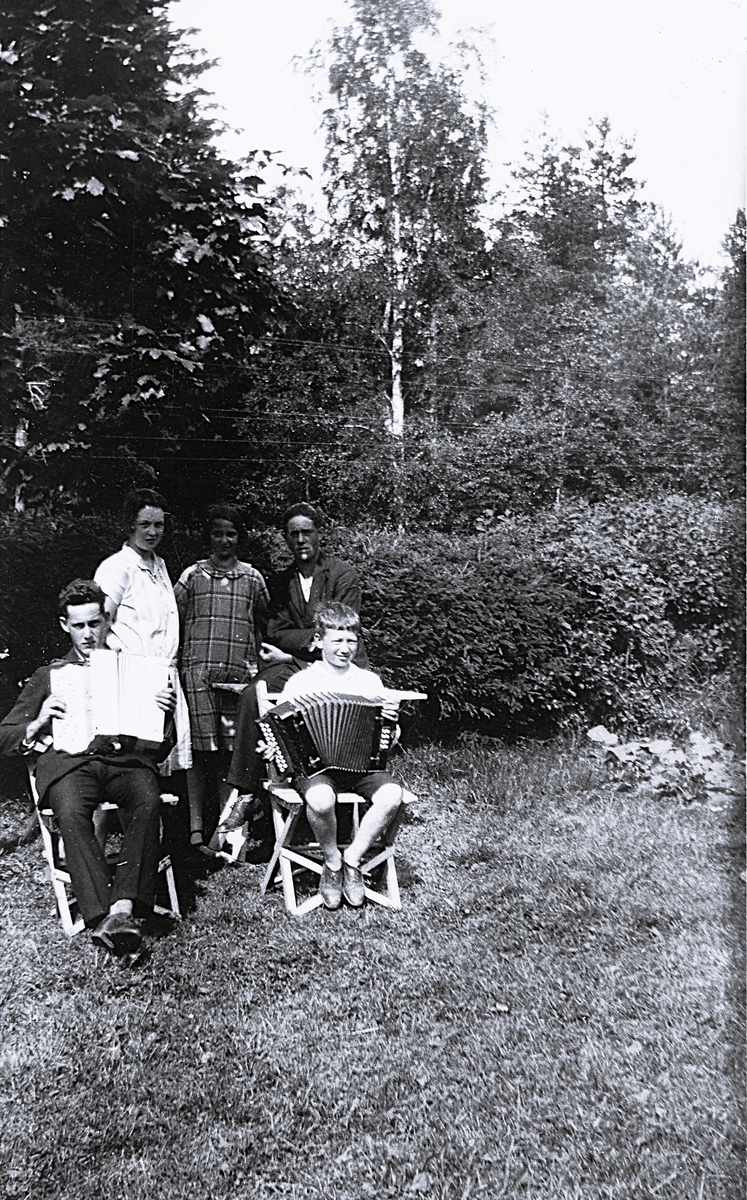 Titel: Två dragspelare samt tre andra personer i trädgården.