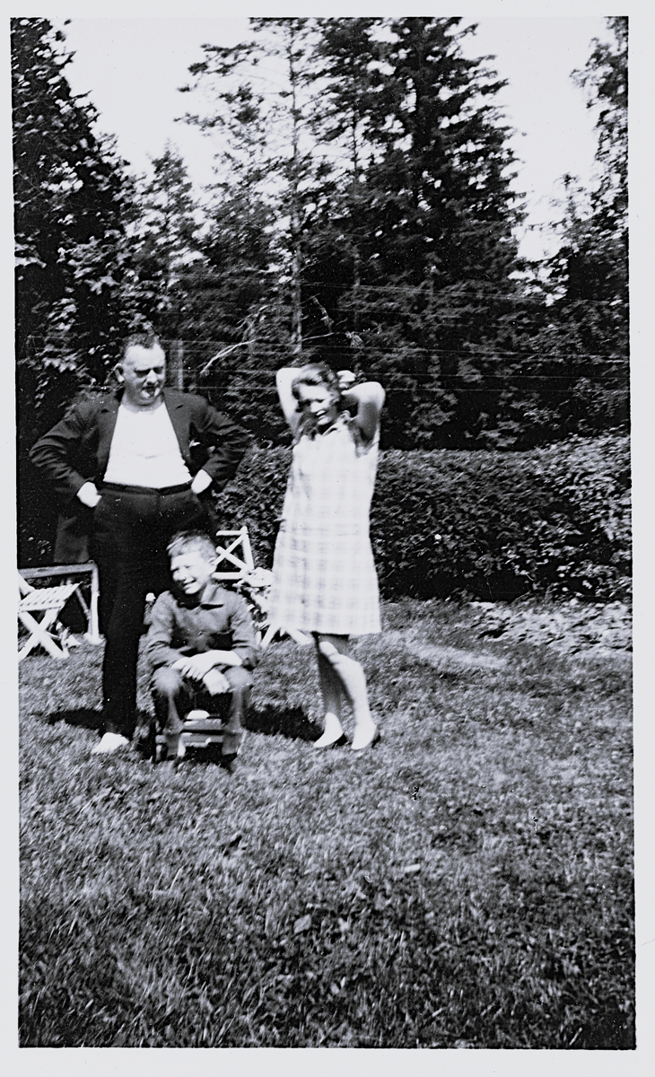 Foto med man, kvinna och pojke i trädgård. Text vid bild i album: "Känns det igen?".