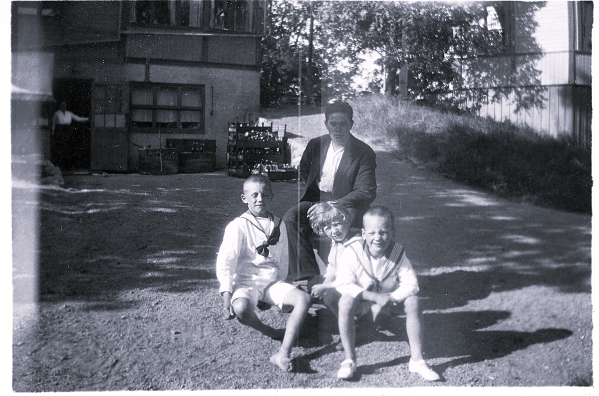 Foto av en man och tre gossar sittandes på gårdsplanen. Text vid bild i album: "Karl-Emil, kusinerna".