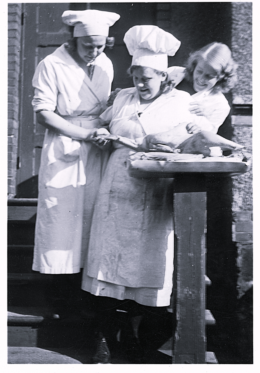 Foto av tre yrkeskvinnor som diskuterar mat. Bildtext i album: "Greta , Ruth, Elsa på Brukshotellet".