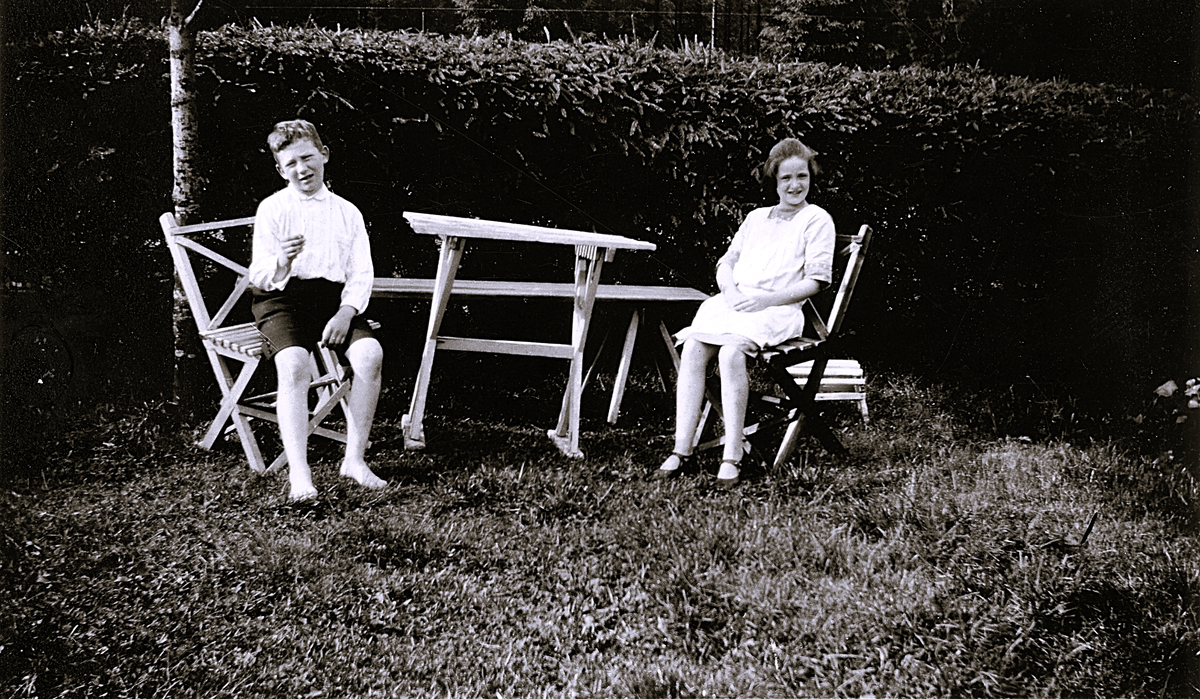 Foto av två barn sittandes på trädgårdsmöbler.