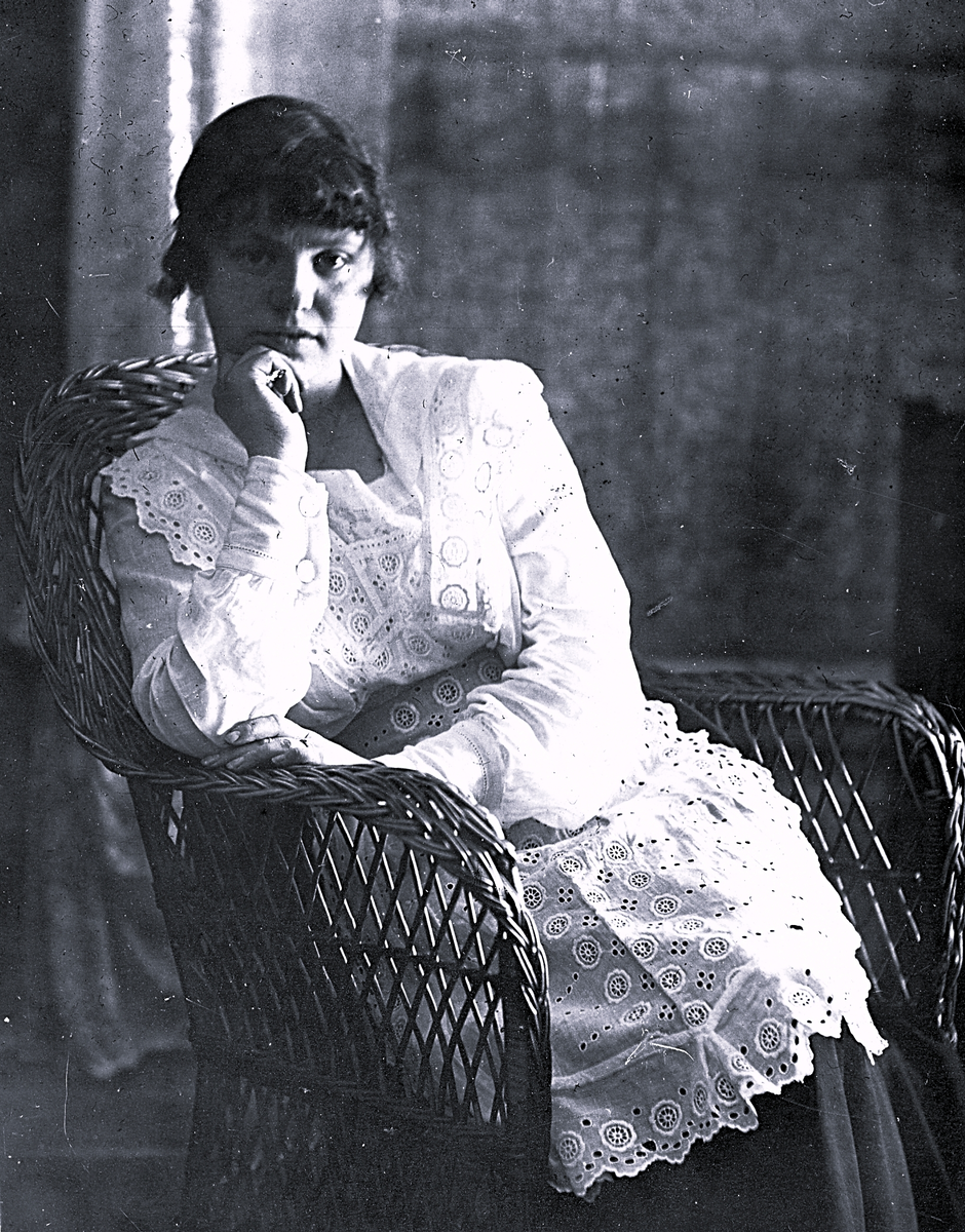Foto av en kvinna i funderingar. Bildtext i album: "Trodde hon skulle bli fru Torgren".