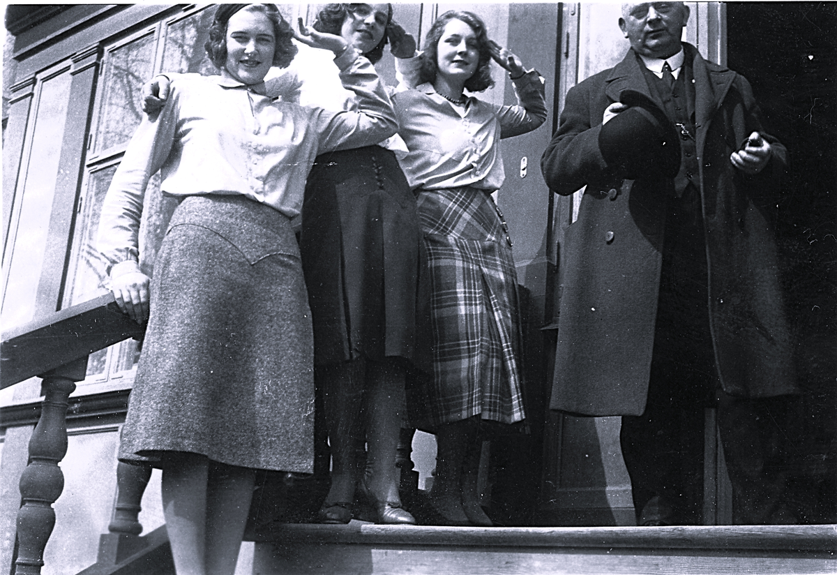 Tre kvinnor och en man stående på en trapp.