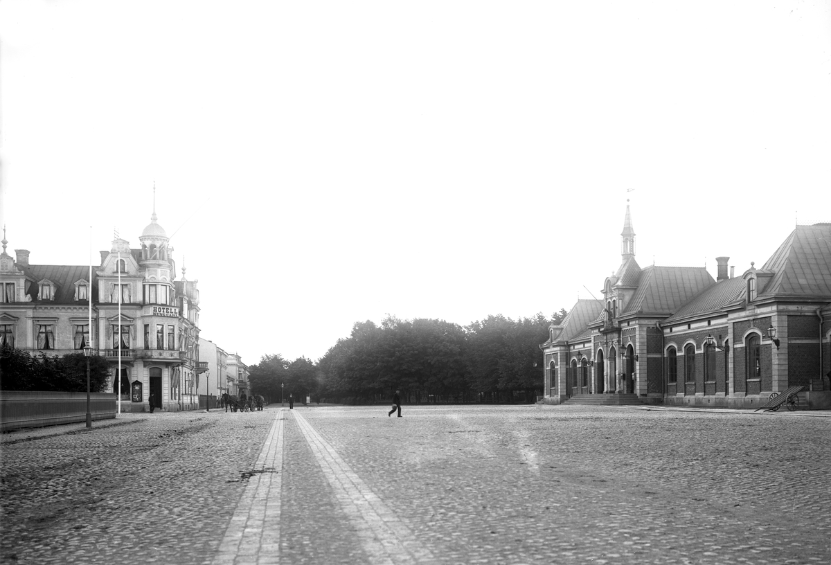 På kuvertet står följande information sammanställd vid museets första genomgång av materialet: Järnvägsstationen, Hamngatan österut år 1903. Det dröjer ytterligare 6-7 år innan hotell Drott uppförs på tomten som skymtar till vänster.