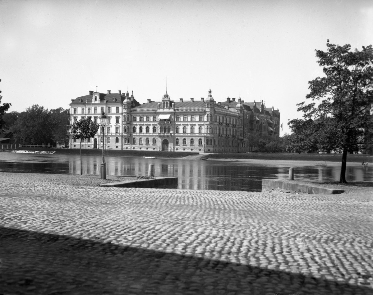 Utsikt över kvarteret Ugglan på en bild från 1909. Mitt i bild, en vattenhämtningsport som var i bruk före vattenverkets tillkomst på Sandgrund år 1890.