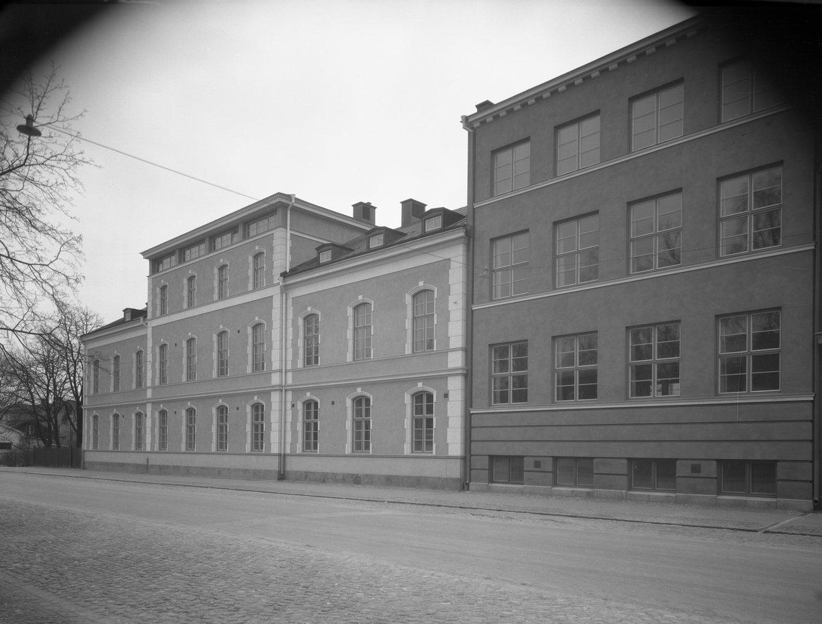 Södra skolan, senare Tingvallaskolan, med tillbyggnad. Skolan byggdes 1872 och var stadens största folkskola tills dess att Herrhagsskolan invigdes år 1906. Båda husen, det nyare byggt runt 1930, revs i början på 1990-talet. Bilden togs 1931.
