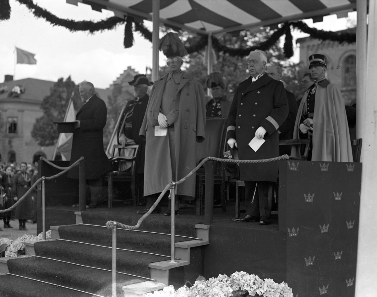 Bildsvit från Karlstads 350-års jubileum den 29 maj 1934. Gustav V med landshövding Abraham Unger till höger och biskop J A Eklund till vänster.