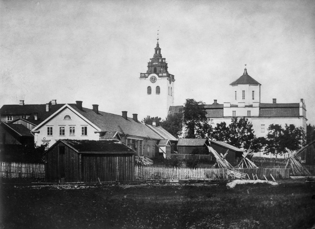 Lancasterskolan, Domkyrkan och Gamla Gymnasiet före branden 1865. Lancaster var namnet på en engelsk pedagogik där äldre elever undervisade yngre.