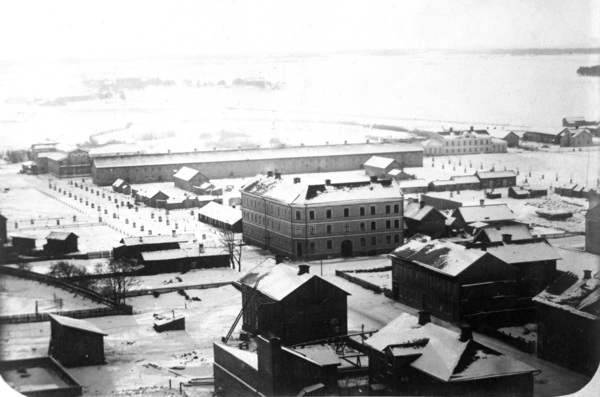Vy från domkyrkan år 1866. Huset i fonden finns kvar i hörnet Östra TorggatanDrottninggatan. Den långa byggnaden i bakgrunden var en nödbostad för brandens husvilla. Oskarpt original.