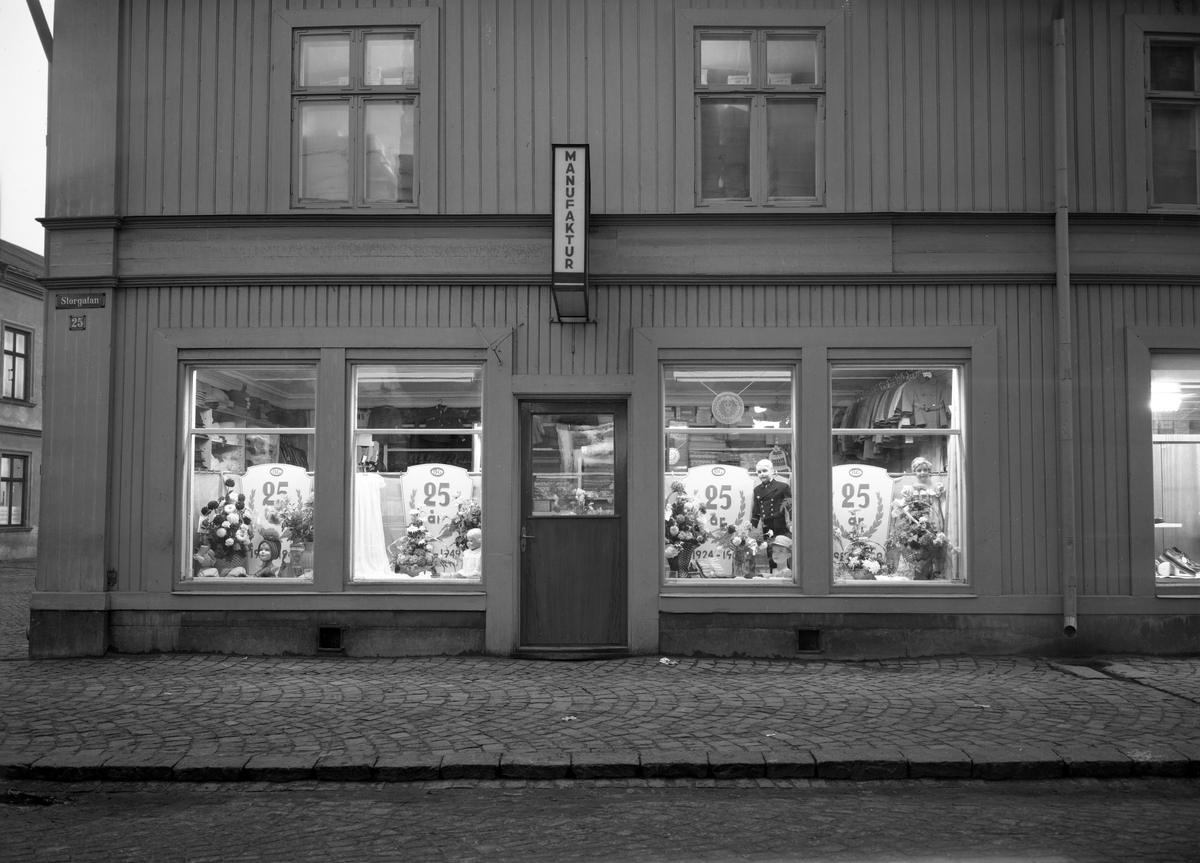 Skyltning i Barngarderobens butik på Storgatan 25. Bilden togs 7/11 1949.