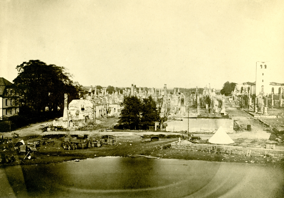 Bild tagen efter branden 1865 med gaveln på biskopsgården till vänster och Herrgårdsgatan till höger.