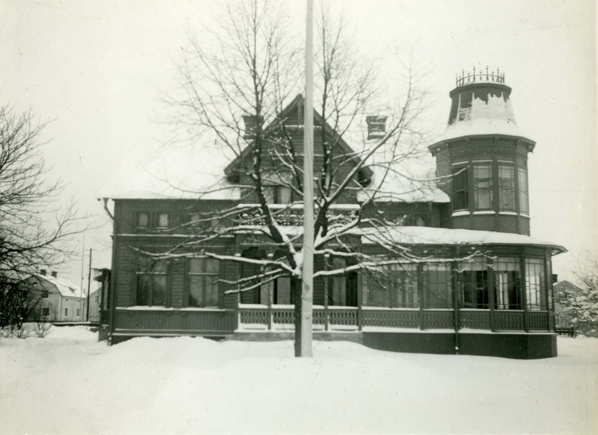 Villan från förra sekelskiftet låg på tomten i hörnet av Rudsvägen-Eriksborgsgatan. Huset revs i slutet av 1950-talet. Oskarpt original.