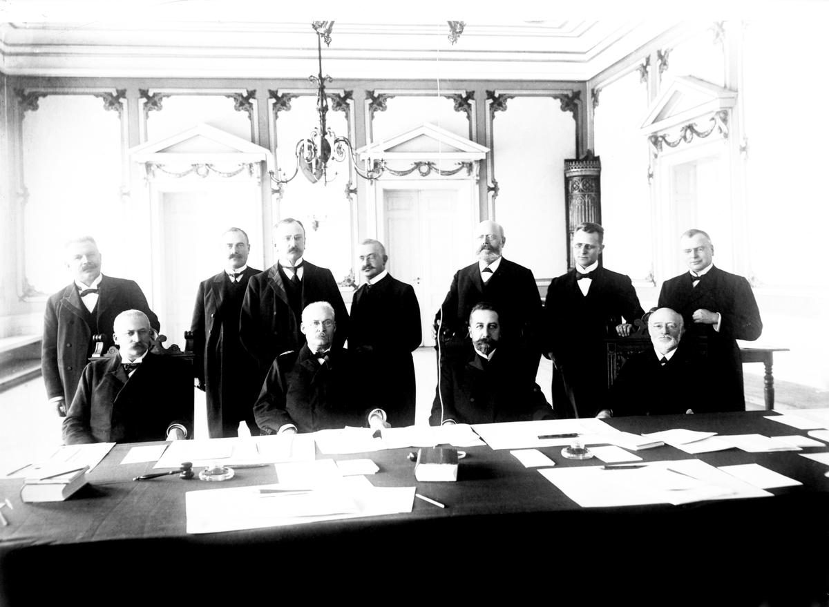 Bild från unionsförhandlingarna 1905. Detta var enda gången båda delegationerna befann sig på samma sida bordet innan förhandlingarna avslutades med lyckat resultat.