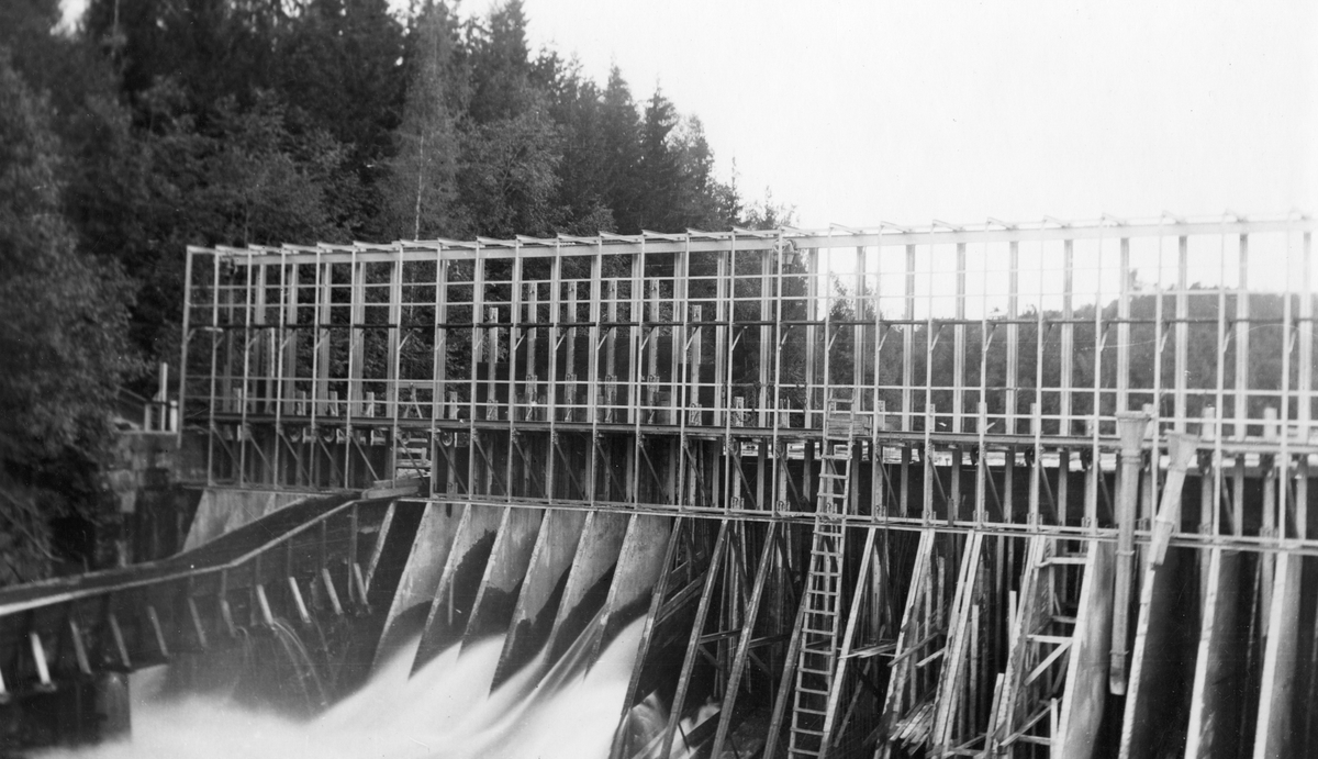 Frykfors kraftstation i Norsälven med timmerränna och dammbord..