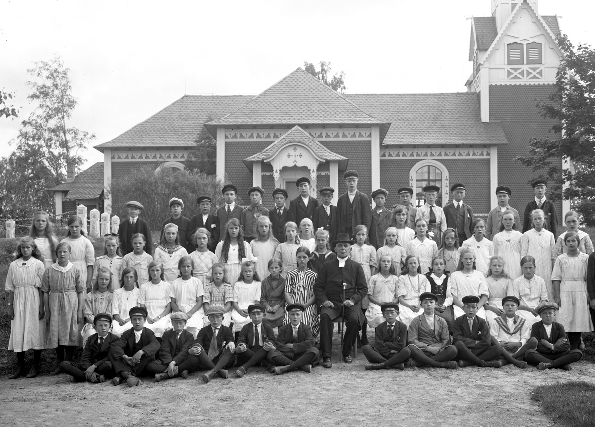 Konfirmand- och/eller söndagsskolegrupp vid Rämmens kyrka på en bild tagen runt 1920.