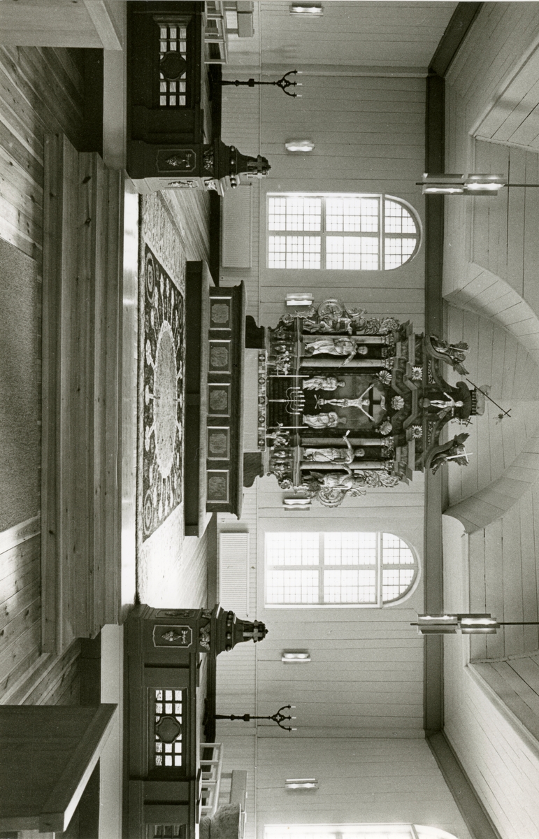 Titel: Övre Ulleruds kyrka, Forshaga kommun. Interiöra bilder mot koret och vapenhuset. Mars 1989. Foto Esse Zetterqvist, Karlstad