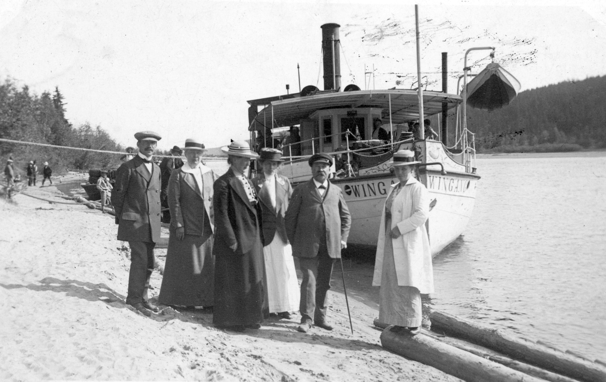 Passagerare som nyss anlänt till Vingäng i Klarälvdalen med ångbåten med samma namn. Den sattes in år 1900 med 2 turer i veckan mellan Edebäck och Vingäng och verksamheten pågick tilll 1925.