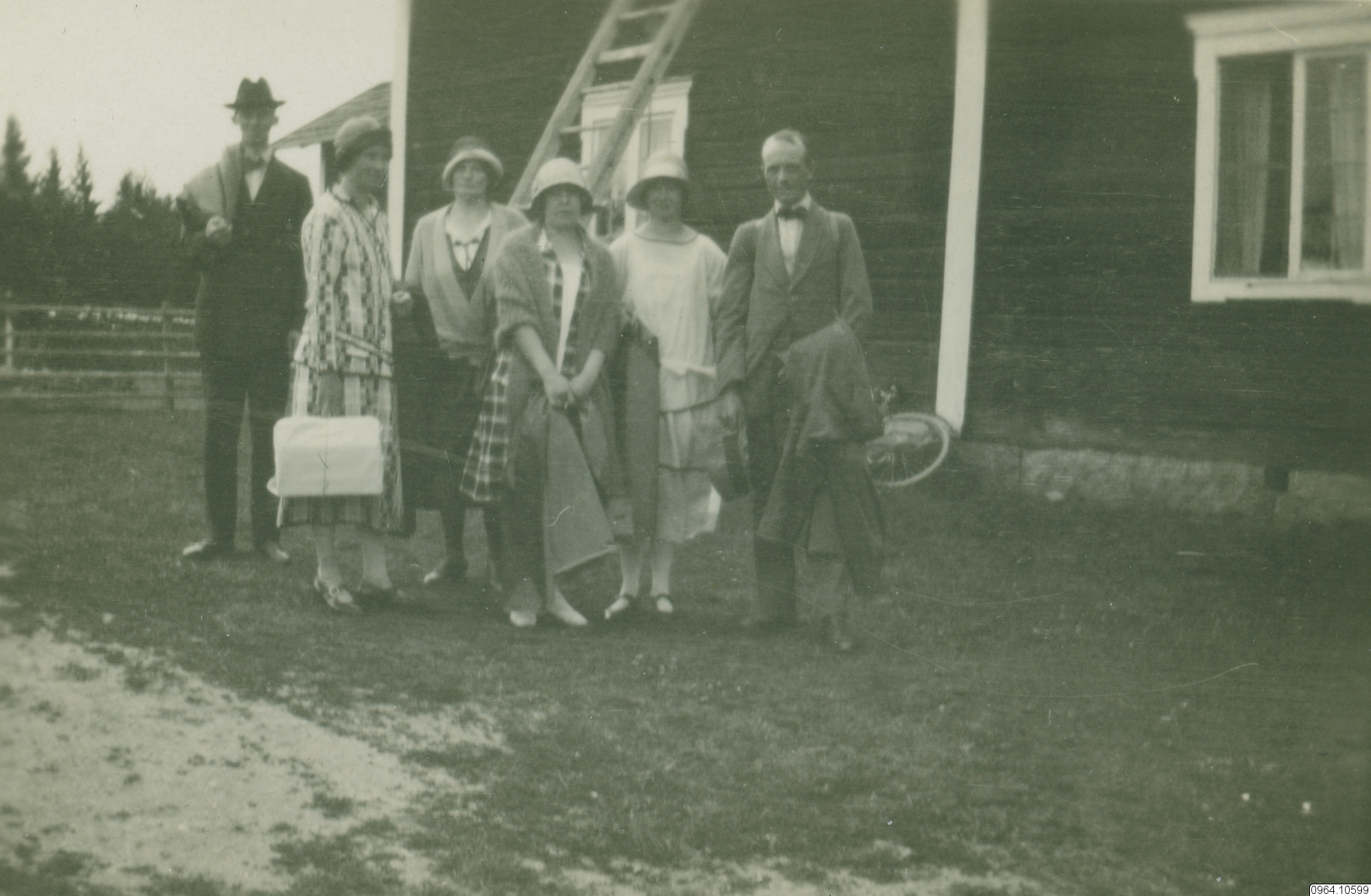Män och kvinnor utanför hus. Missionärer med resväskor. En stege står lutad mot huset.