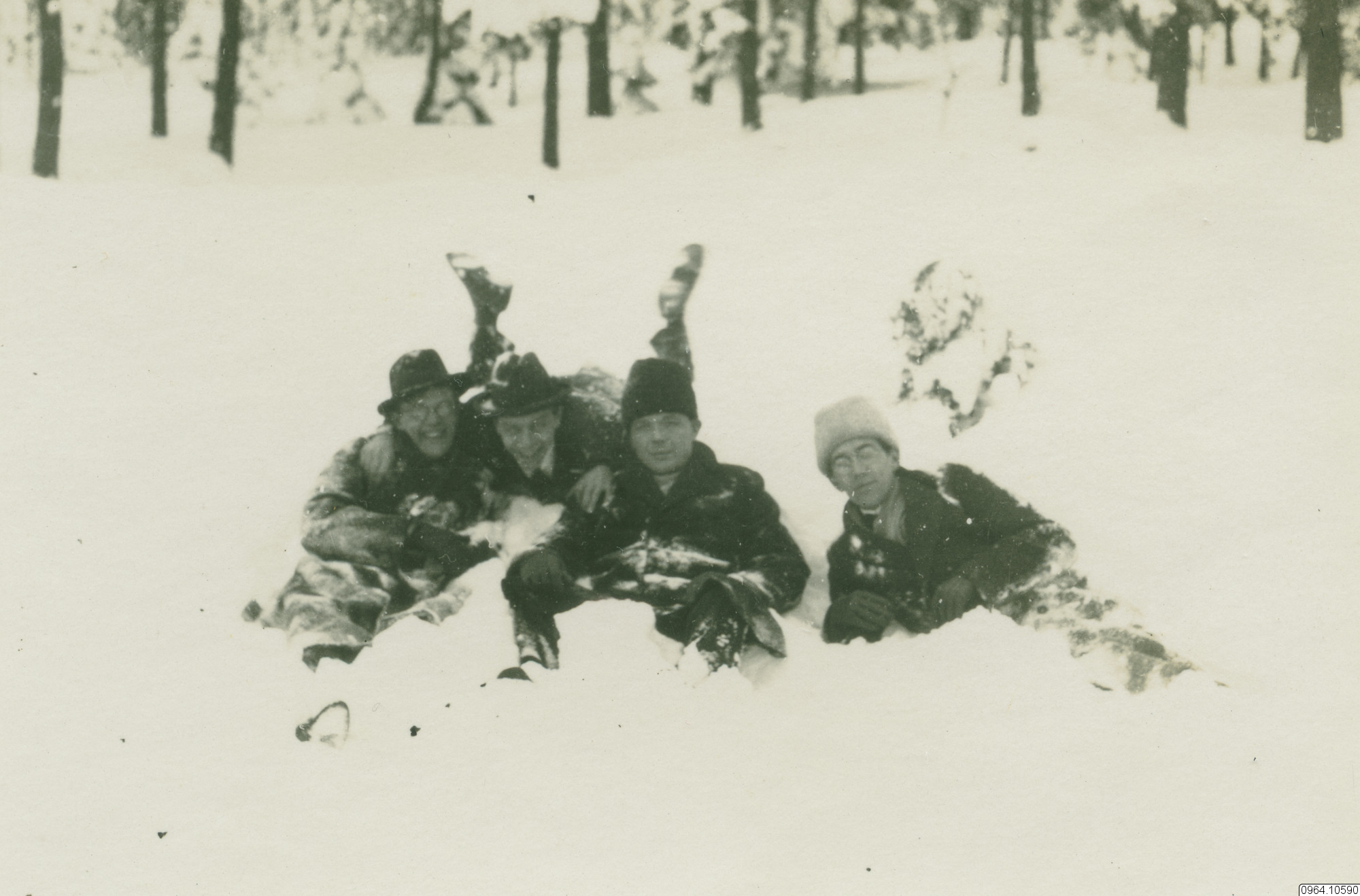 Fyra män i vinterkläder som ligger i snö. Möjligen är en av dem Artur Vilén.