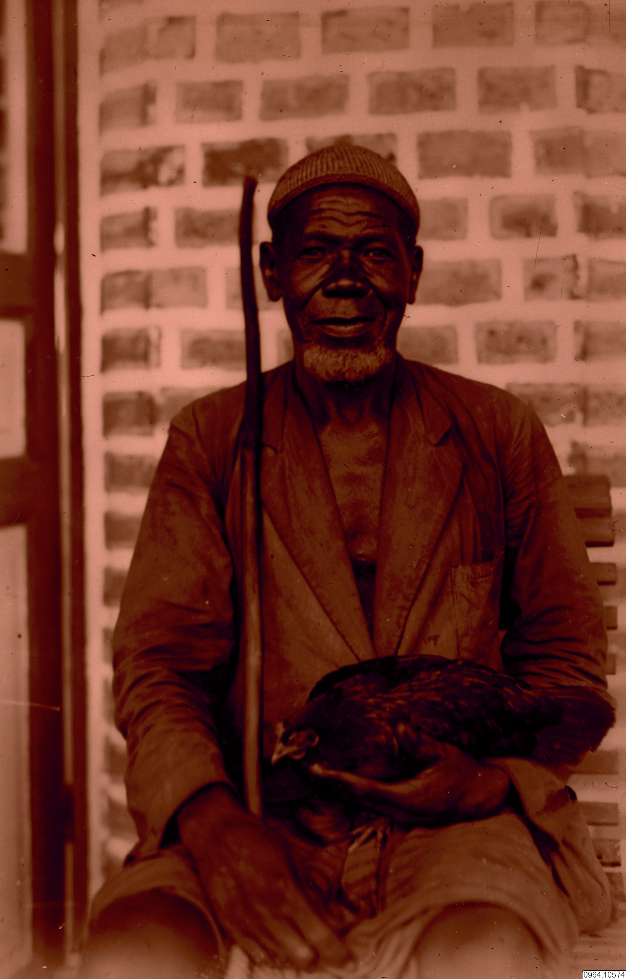 Makoza (Makosa) sittandes med en höna i famnen och en stav.