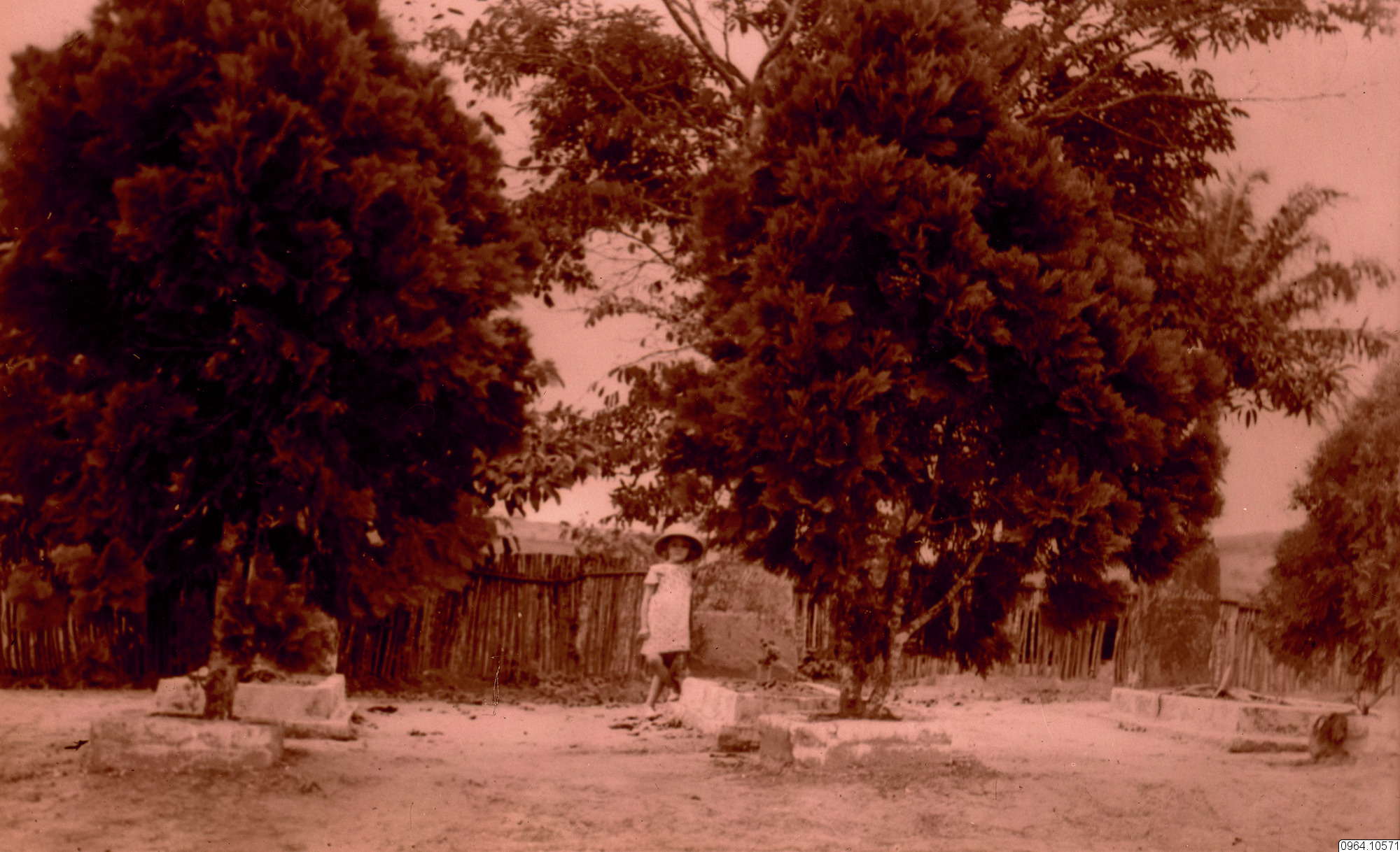 Missionärsbarn med tropikhjälm i trädgård med träd. Staket i bakgrunden.