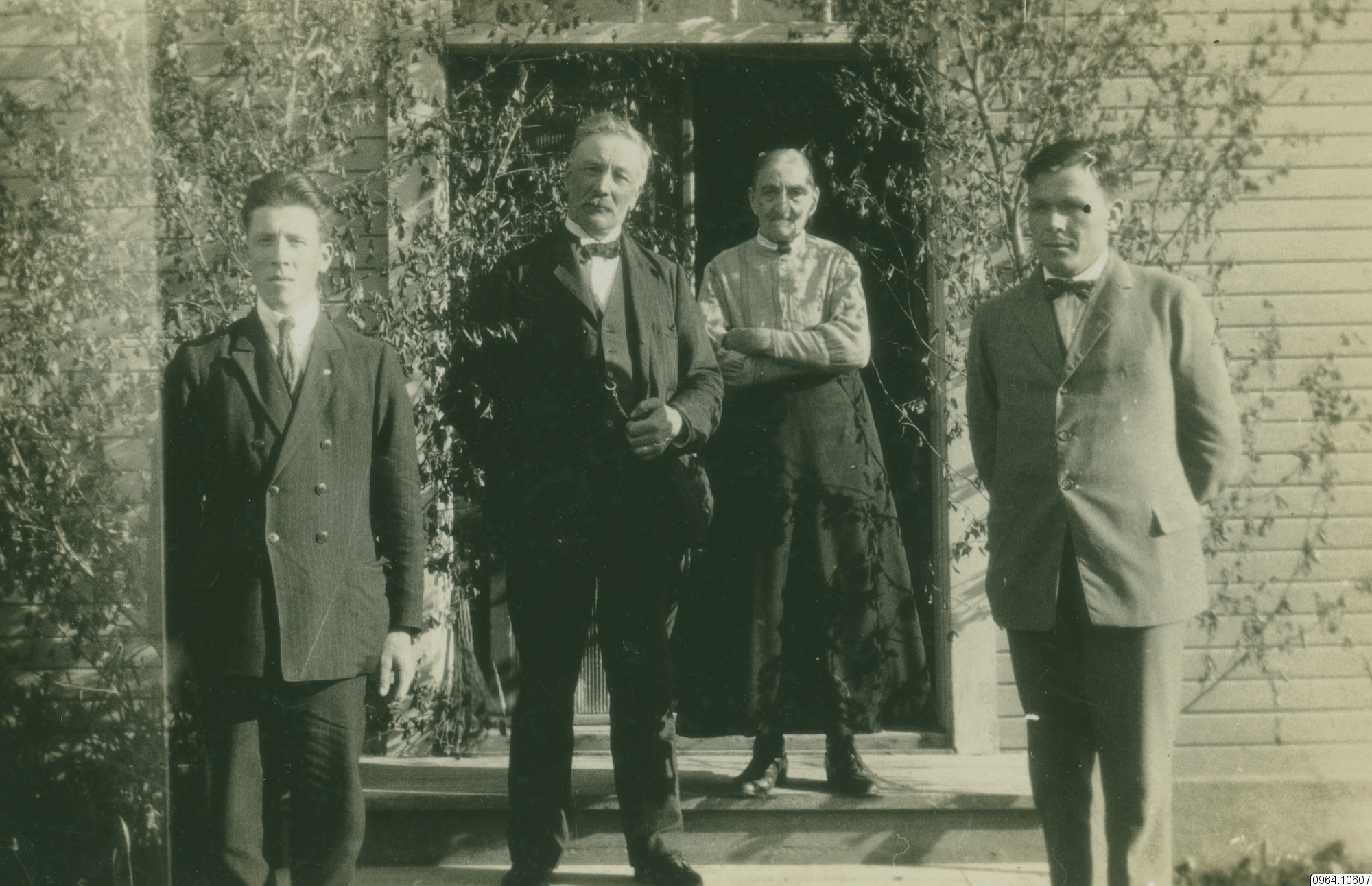 Tre män i kostym och en äldre kvinna utanför hus.
