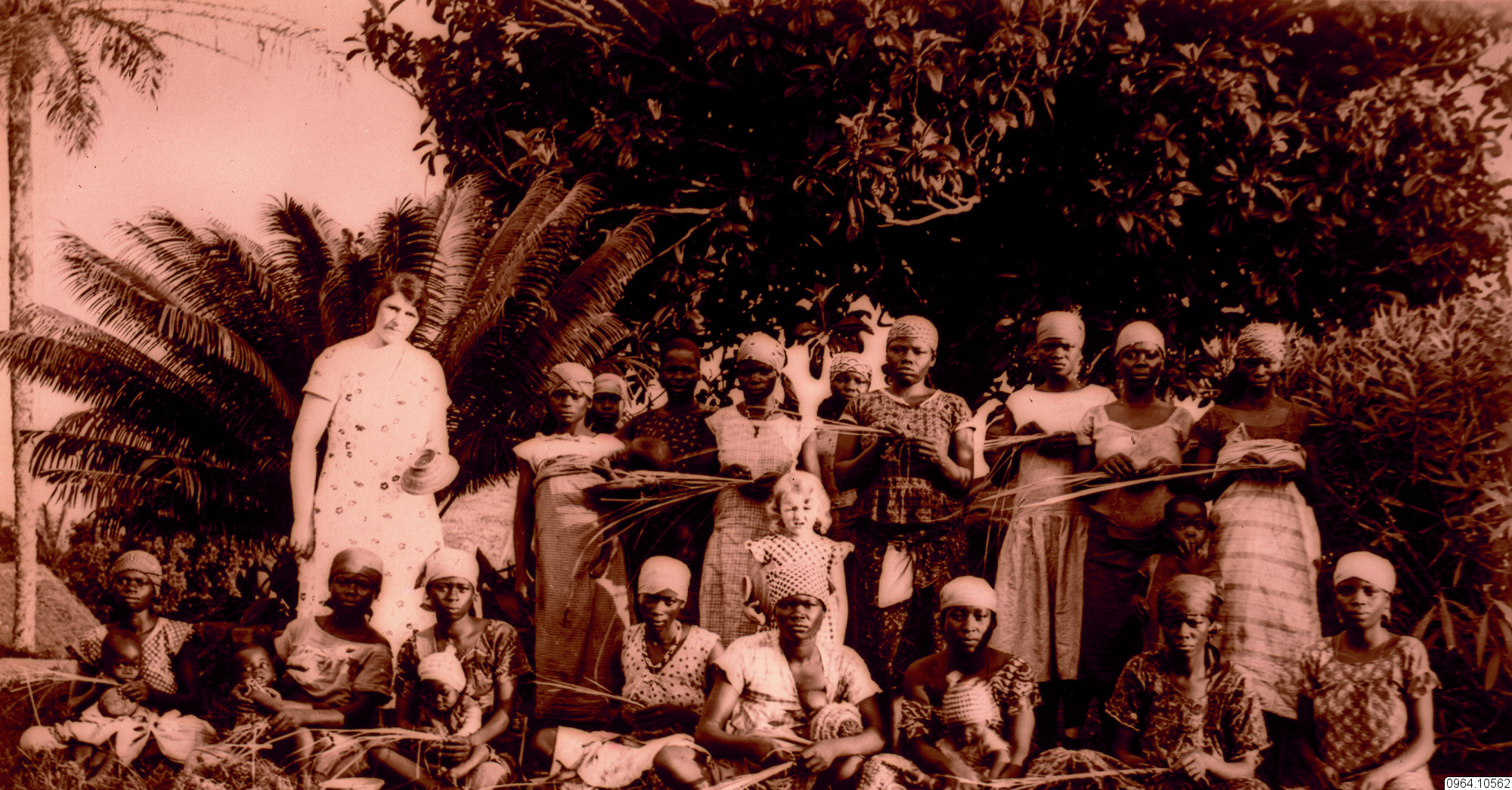 Gruppbild med kvinnor, flera sitter på marken. En missionär.