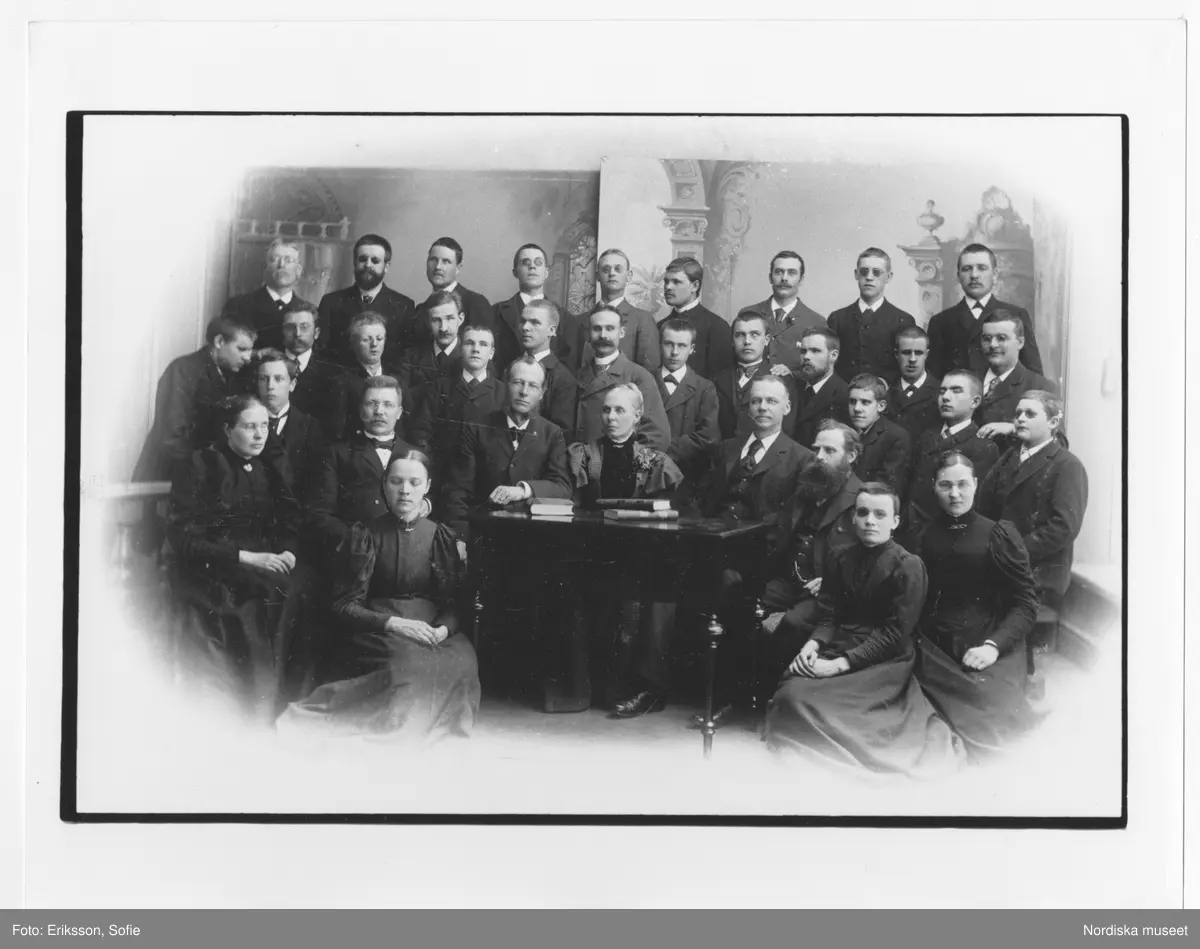 Elever och lärare. Lärare i mitten fr v Fredrik Westblom ( glasögon, mustasch ), lärare; vid bordet J l Nygren, lärare, Sofie Louise, lärare, Sven G Sikström, föreståndare.