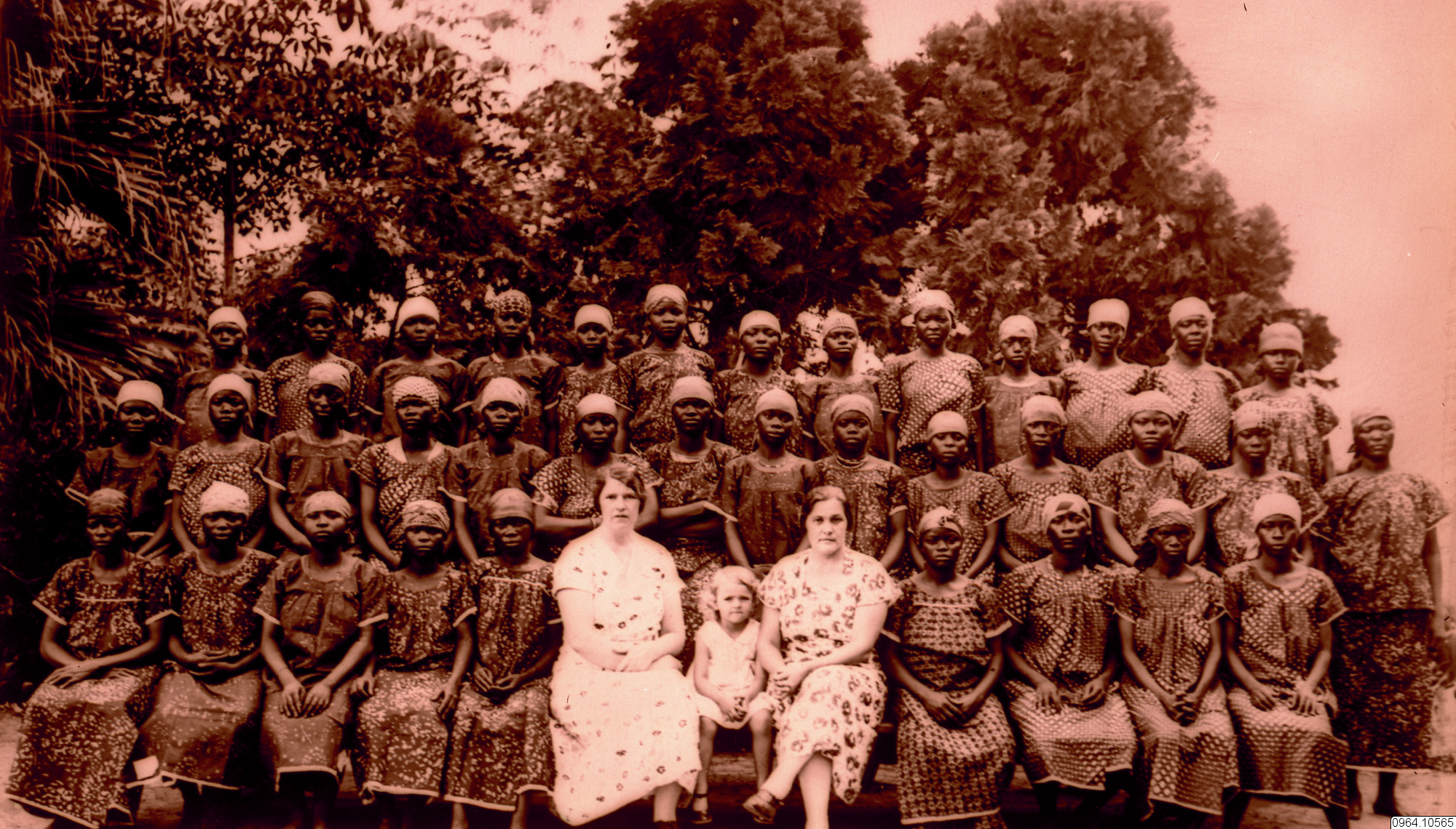 Gruppbild med kvinnor. Centralt två missionärer och ett missionärsbarn.