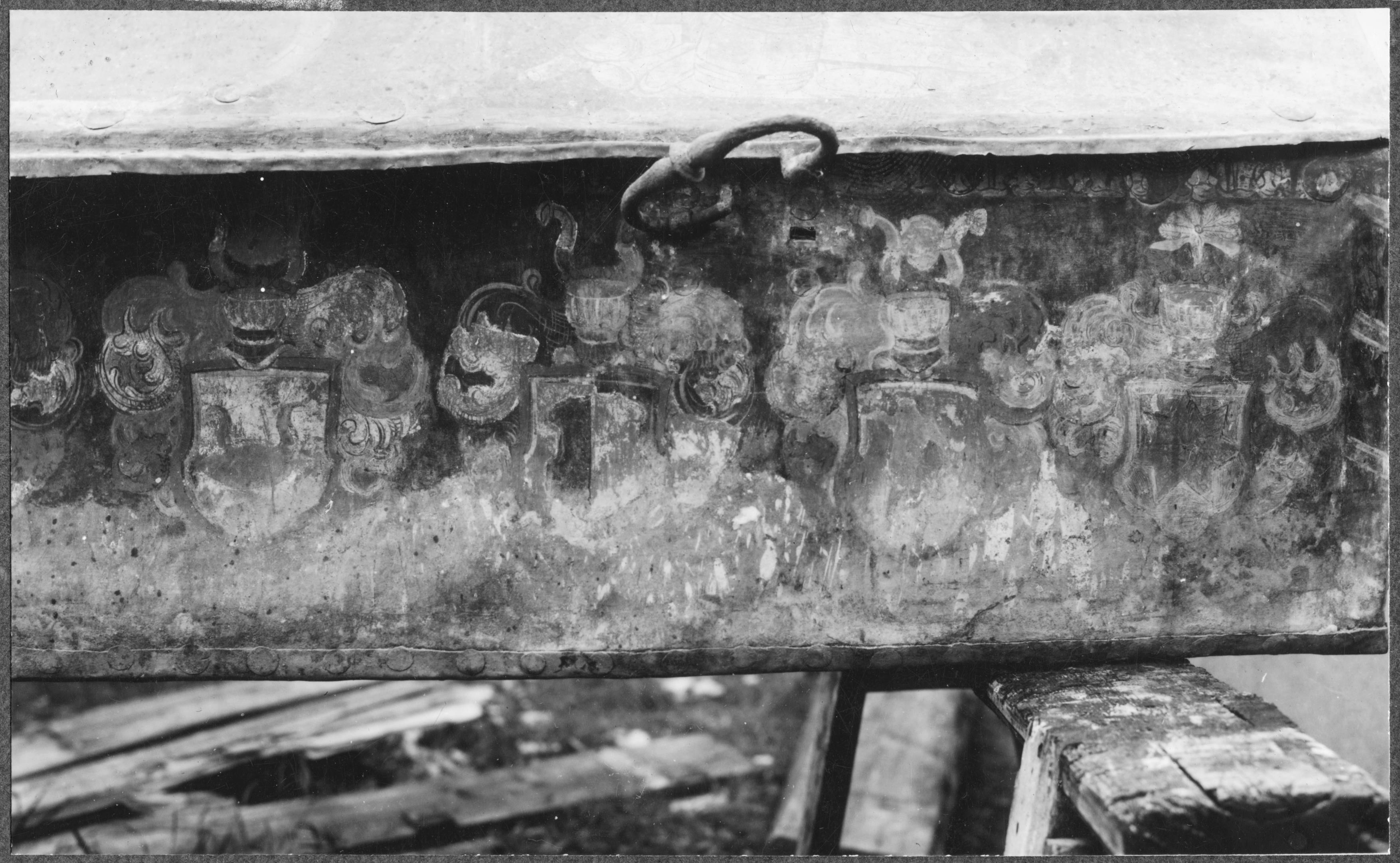 Beskrivning: Hans Kyhl och Elin Drakes kista. Detalj med fädernevapen.