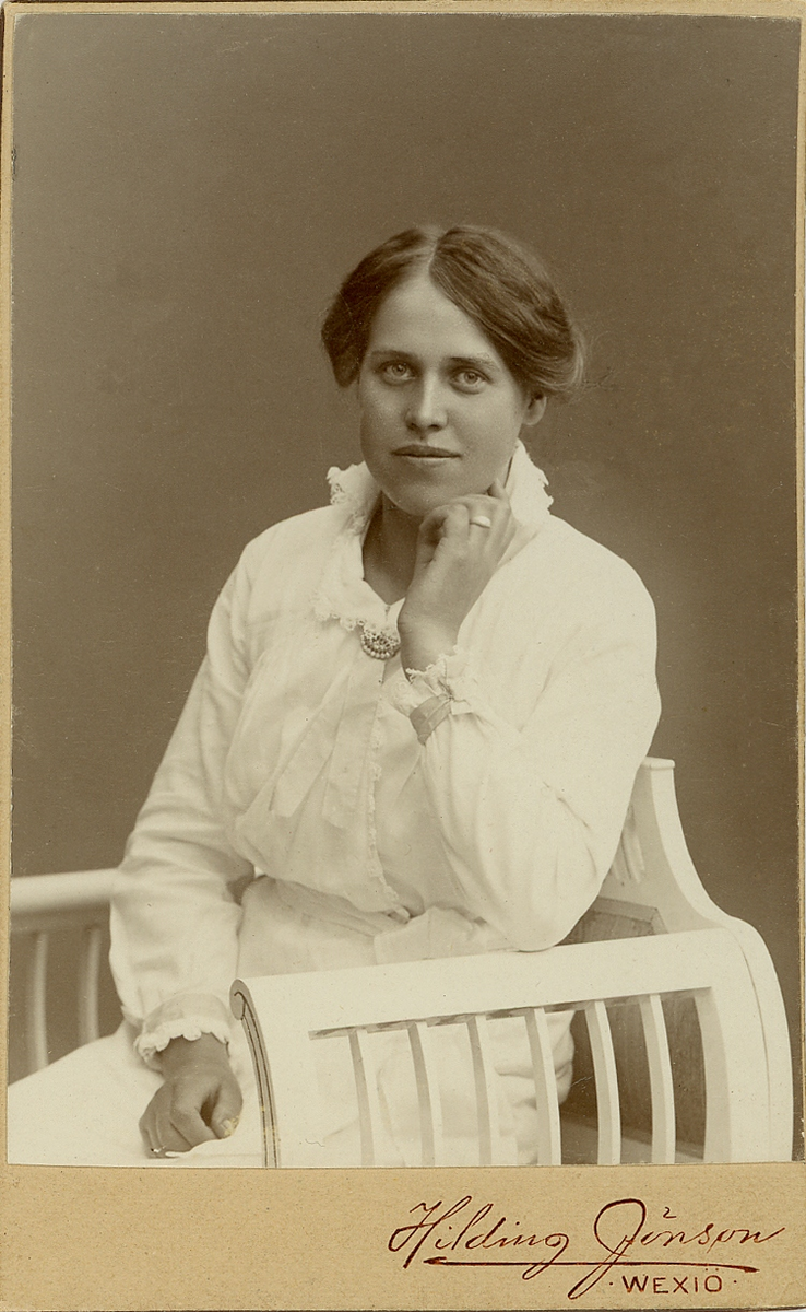 En kvinna i ljus blus med spetskrage (där det skymtar en brosch) och ljus kjol. Hon sitter i en vitmålad karmstol.