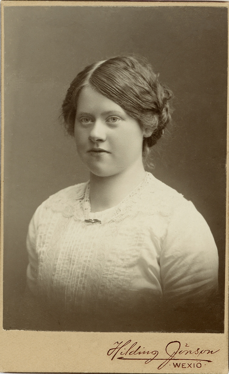 En ung kvinna i ljus blus med stråveck, spetskrage och en liten brosch.