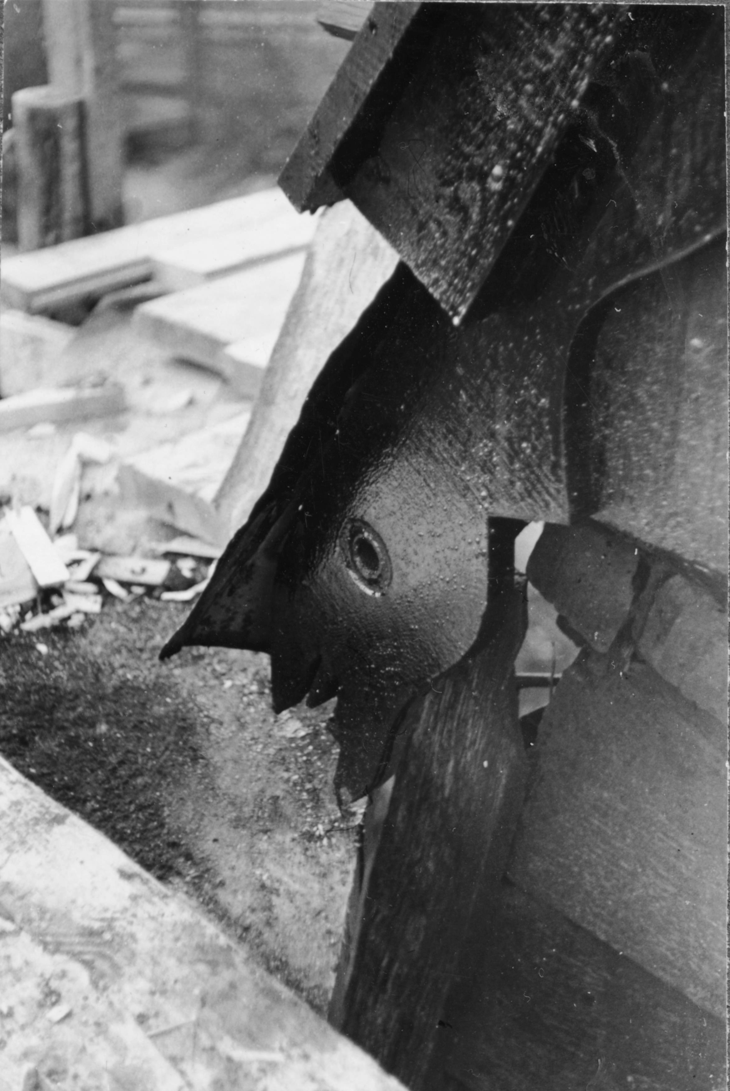 Klockstapeln, den i maj -55 uppsatta nya vindskivan (den v.) på södra gavelröstet, drakhuvudet sedermera avlägsnat.
