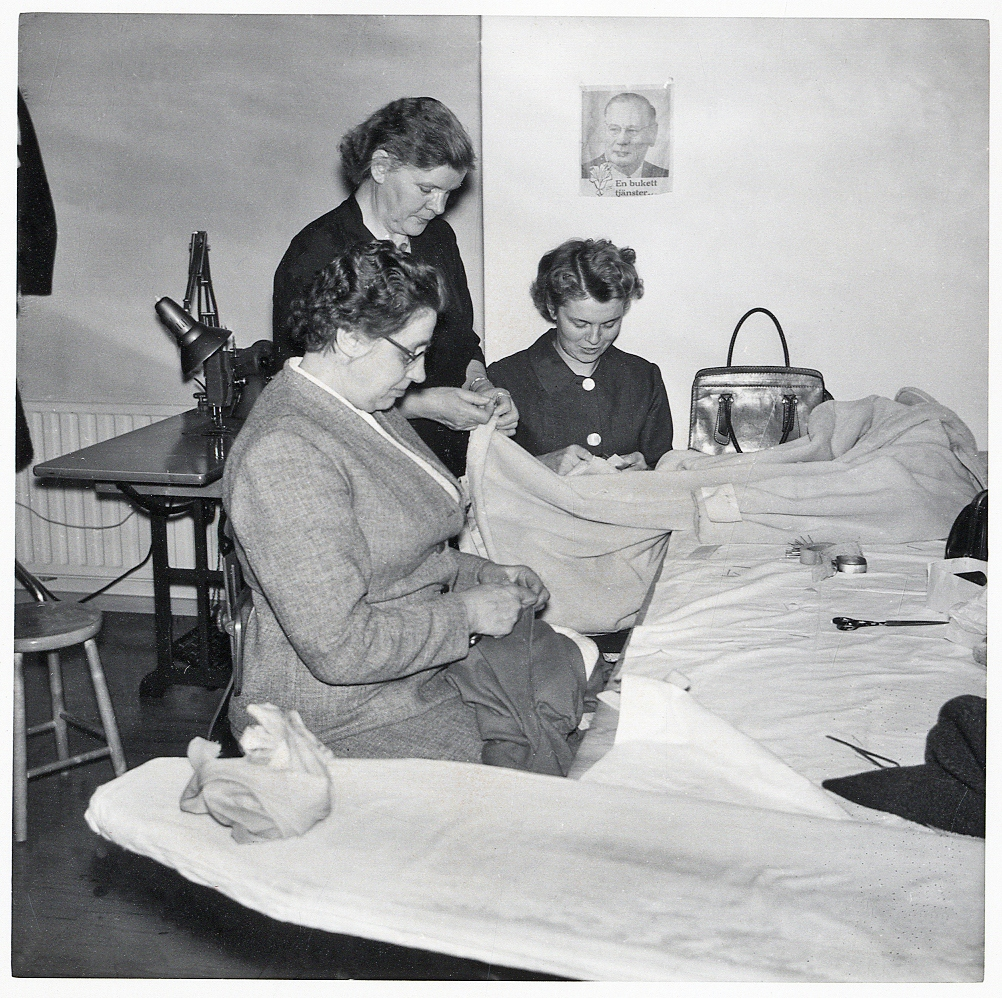 Tre kvinnor är sysselsatta med ändringsarbete av några kappor.