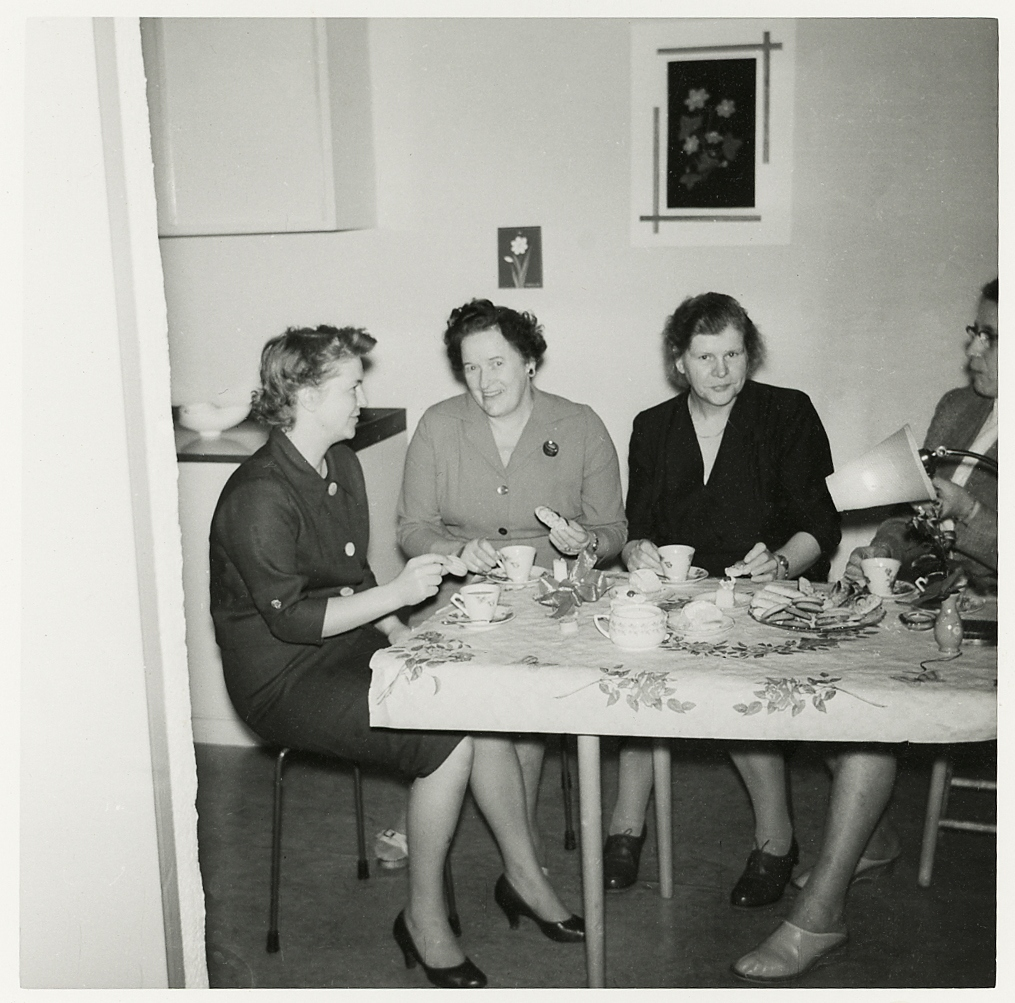 Kaffepaus i arbetet. Fyra kvinnor har slagit sig ner vid kaffebordet.