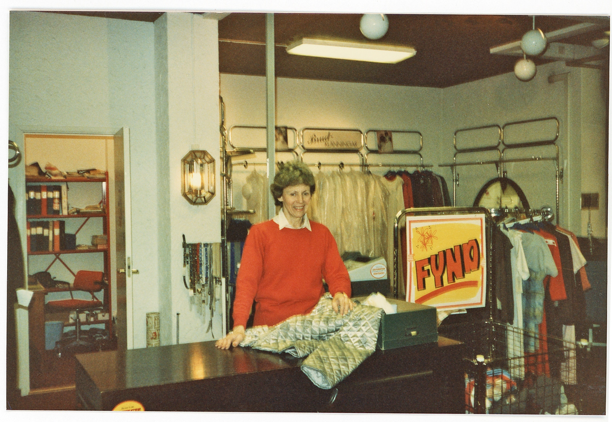 Ett av affärsbiträdena visar upp en vadderad jacka.