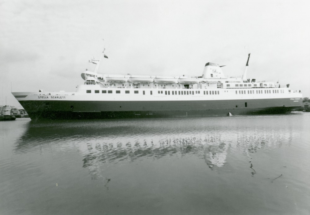 Svartvitt fotografi av M/S Stella Scarlett. Hon ligger i lugnt vatten och den lilla bakgrund som syns utgörs endast av en byggnad, längst till höger i bild, och otydliga objekt till vänster i bild. Möjligen är fotografiet taget vid sjösättningen 1974 vid varvet i Tyskland. På baksidan finns nämligen stämplat "Jos. L. Meyer Schiffswerft - Maschinenfabrik 4490 Papenburg/Ems". Dessutom ses hon på fotografiet under tysk flagg.