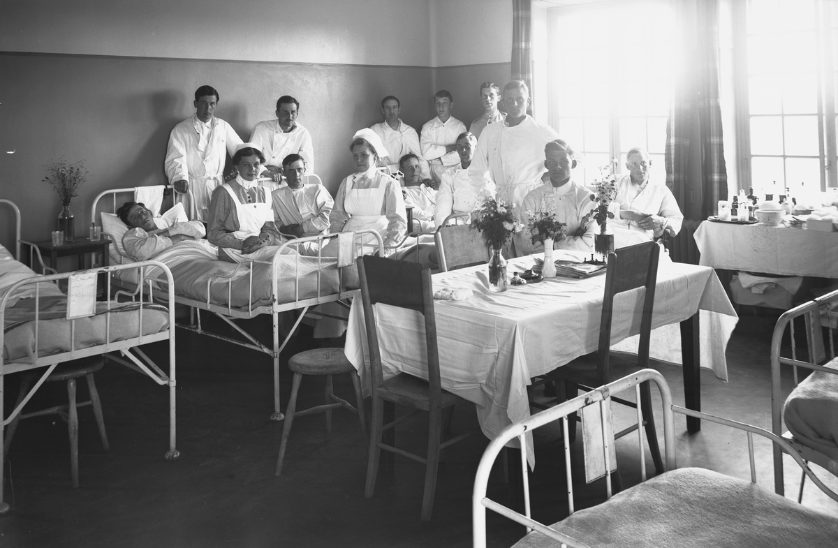 Sjukhus interiör, 12 soldater och 2 sjuksystrar.