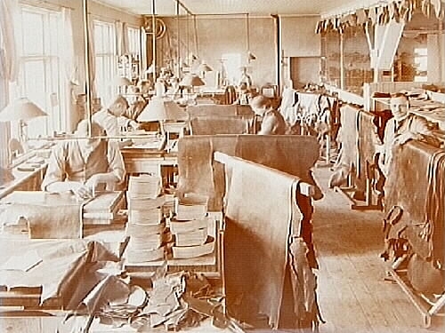 AB Skofabriken Kronan, fabriksinteriör, tillskärning av ovanlädret, 10 tillskärare.