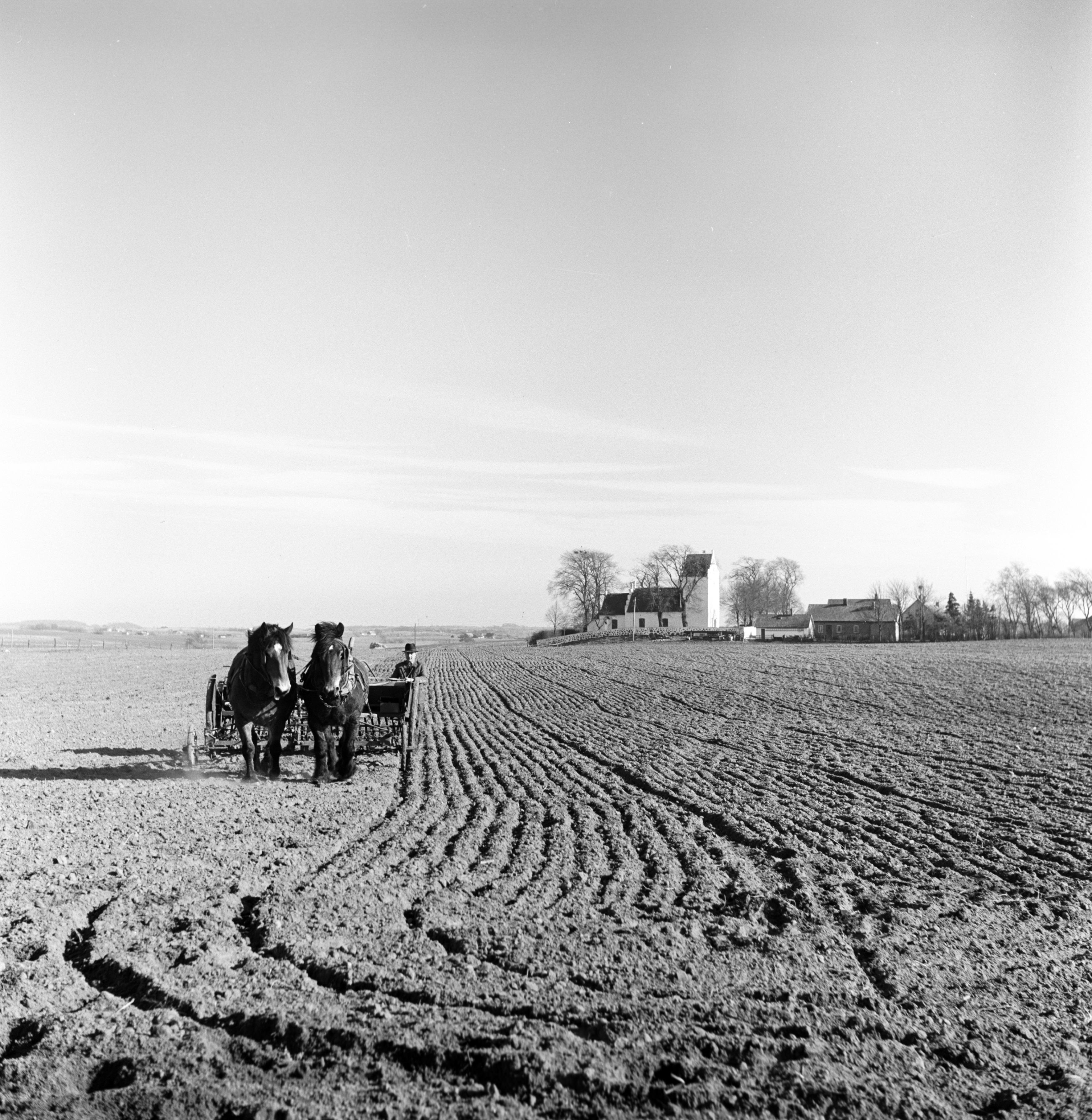 Harvning av åker, med hästar. I bakgrunden Törringe kyrka. Bilden tagen på 1940-talet.
