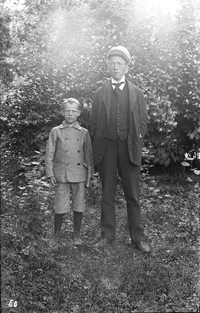 Dals Rostock. Två pojkar. Den äldre har en mössa märkt med "Rostocks Brunn".