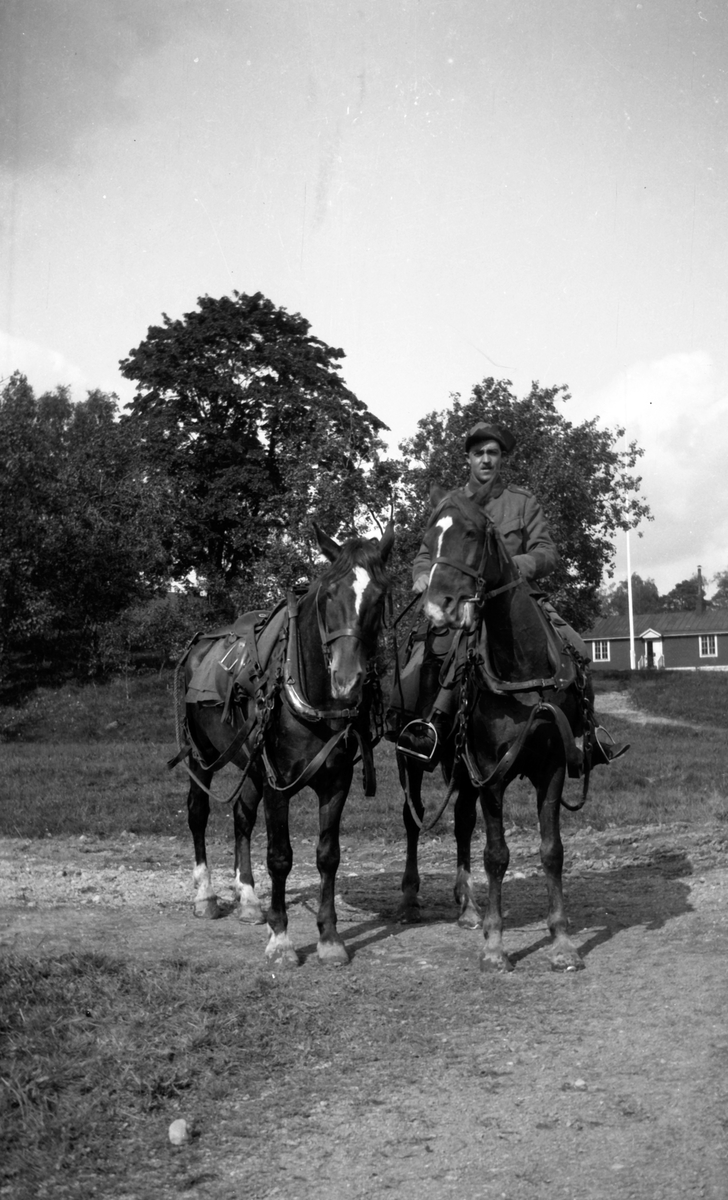 Militärövning i Småland. Det är soldater från I 12, Ing 2 och A 6 och de bär uniform m/1910 (med varianter). Här en ryttare med två hästar.