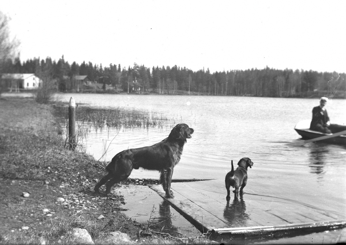 "Rapp k. männe", två hundar på brygga. En man som sitter i en roddbåt.