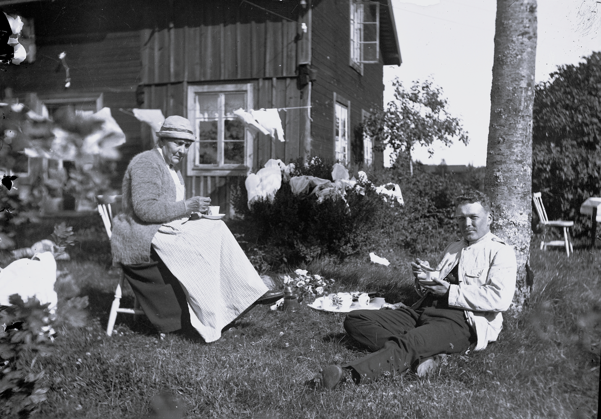 Dam och man sitter i en trädgård och fikar, tidigt 1900-tal.