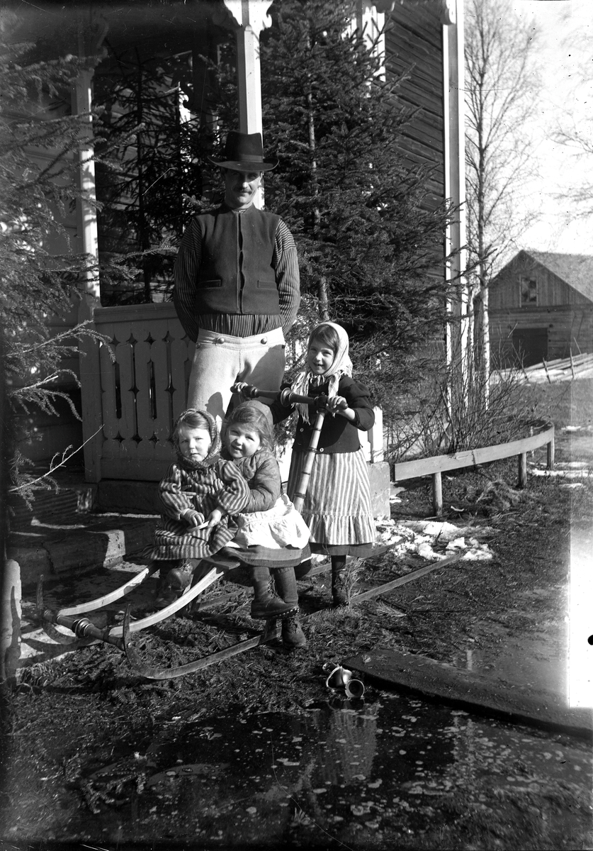 Man och tre barn med en sparkkälke.