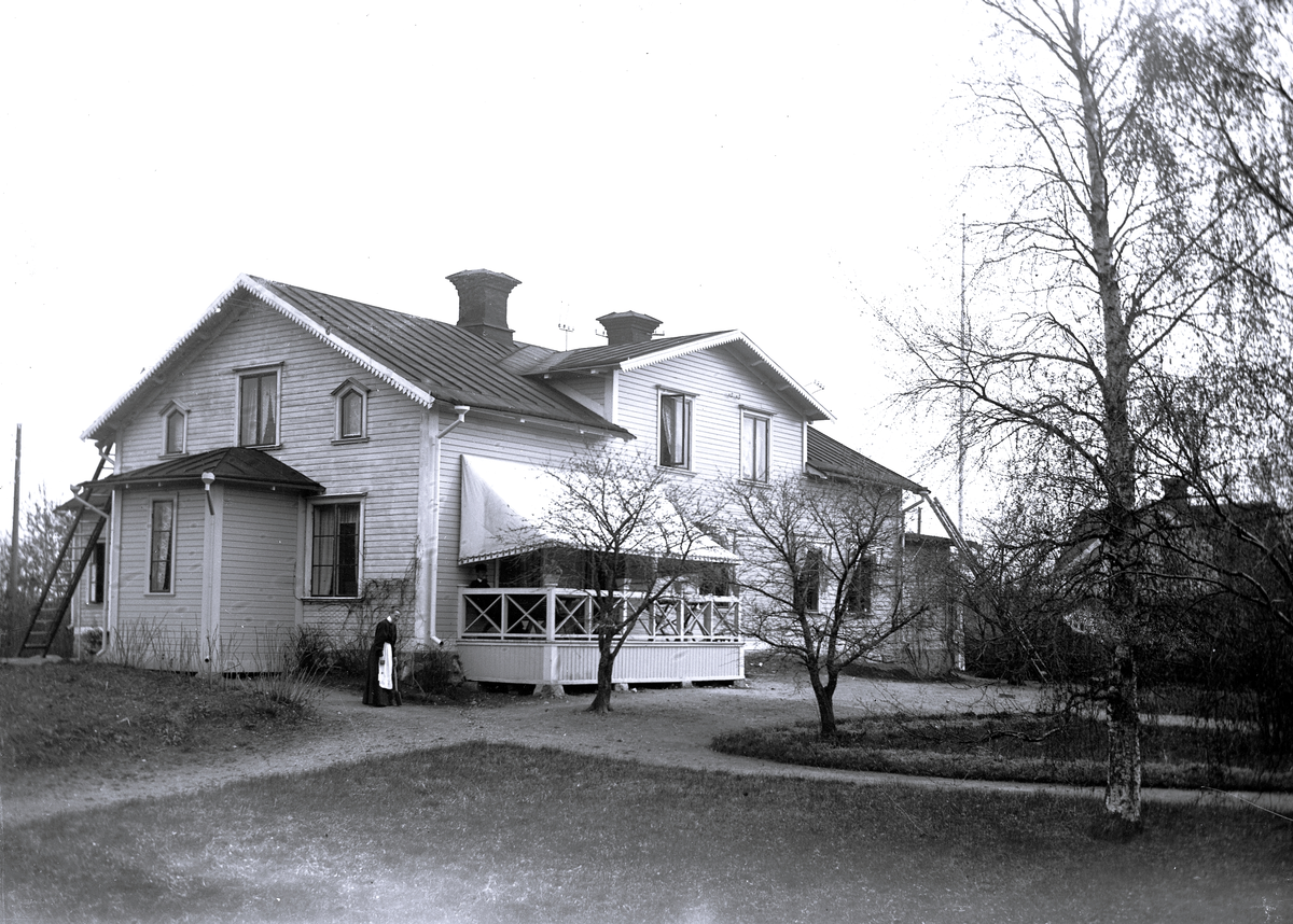 Märkt "Kontorsbyggnad (2)". En kvinna står utanför det vita trähusets veranda.