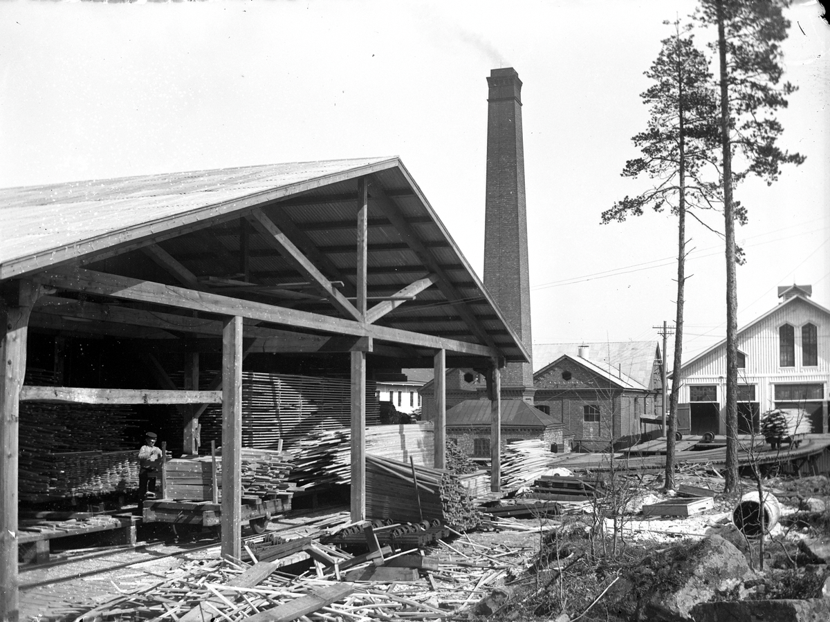 Bild märkt "Torkhuset", fullt med timmer. En skorsten syns i bakgrunden, en del av industrianläggningen.
