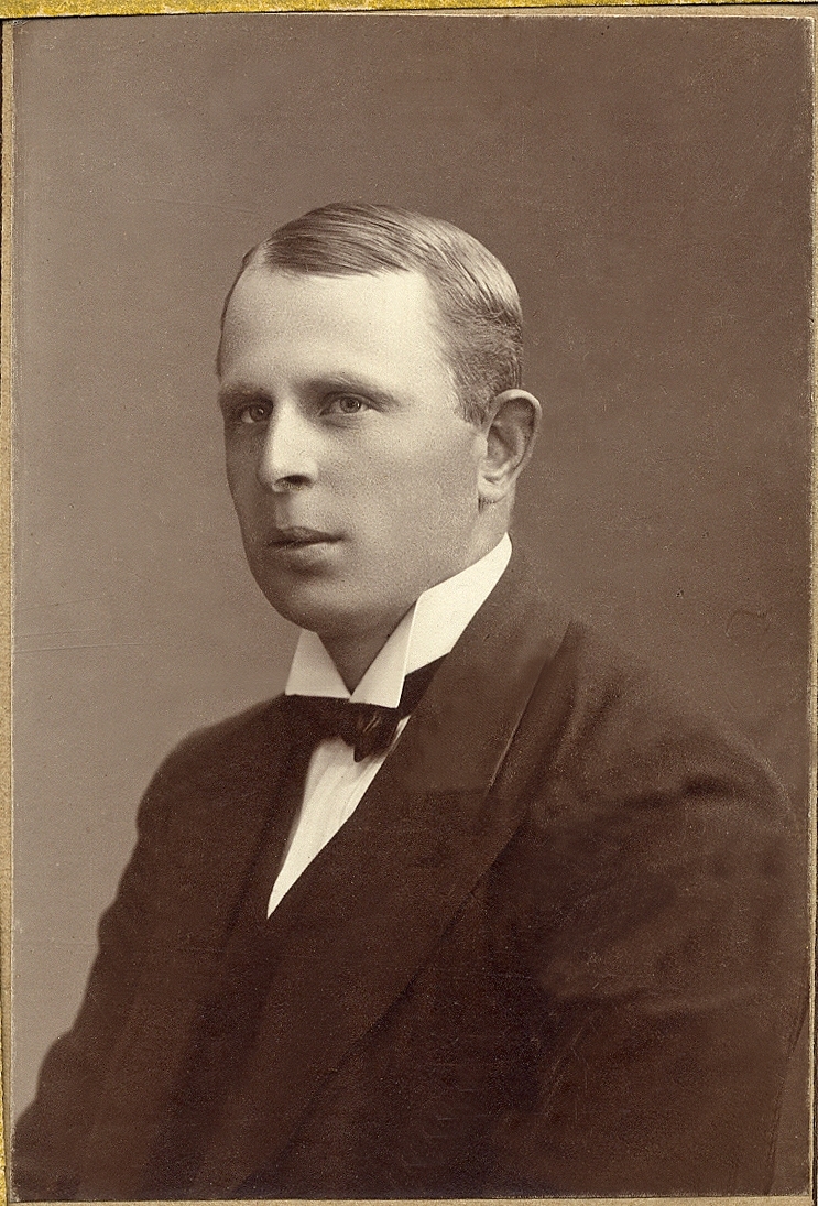 En man i mörk kostym med stärkkrage och mörk fluga.