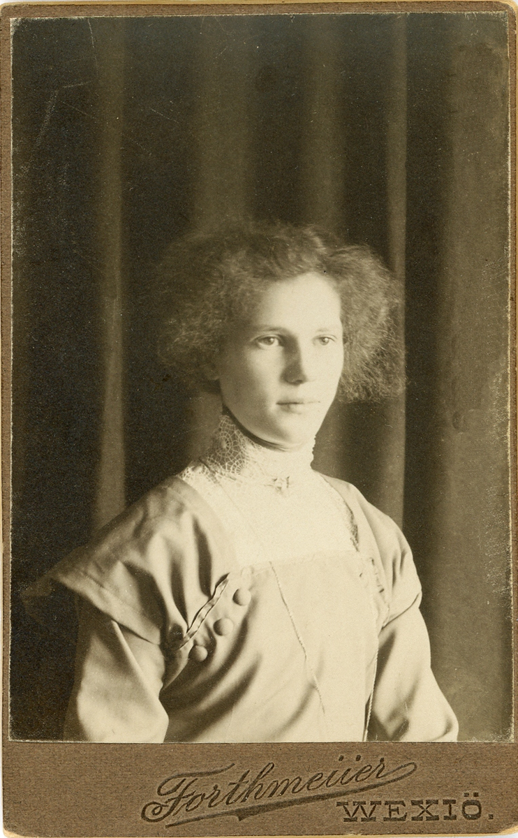 En ung kvinna i höghalsad blus med spets. Man skymtar en halskedja och en brosch i halsgropen.