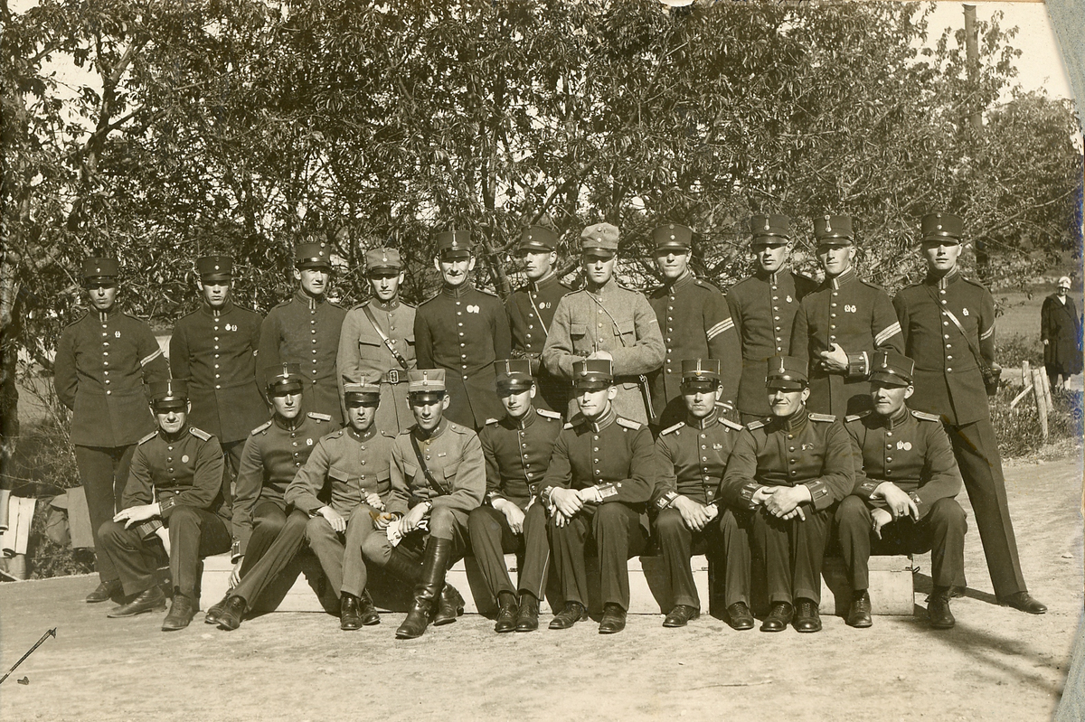Gruppfoto av en pluton furirer (?) med en löjtnant och en kapten i främre ledet. I bakgrunden syns en nyfiken kvinna i kappa och hatt.
